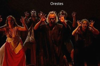 The Elektra opens with an upstage screen projection of a second-century BC papyrus from Euripides’ music for the Orestes. An actor points to the screen reading out the words and, as the reconstructed music is played, the company sing and relate arm movements to the sound heights depicted graphically on the inscribed music.