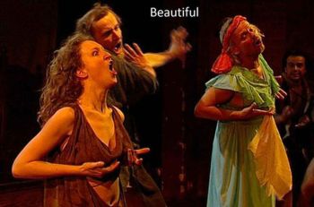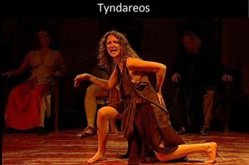 The chorus splits to perform a war of the sexes as the female half side with Clytaemnestra and the male half with Agamemnon over the issue of Iphigeneia’s sacrifice. Parts of the choral ode are also distributed to Iphigeneia and to a messenger figure played by a well known Polish actor Krzystof Globisz.