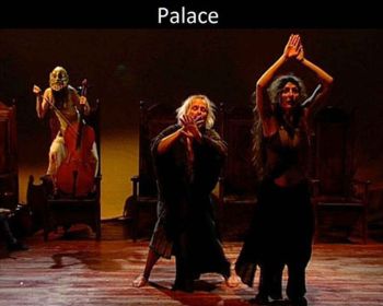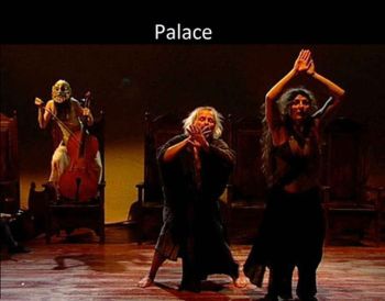 Identifiable gestures emerge time and again, either in flowing movement or with an avowedly semiotic purpose to underline, parenthesise or contrast with the prevailing dramatic mood. For example, the harrowing sorrow of Clytaemnestra (Joanna Holcgreber) is expressed almost entirely in gestures of lamentation culled from Greek vases but with a depth of feeling and fluidity which cannot be attributed to simple imitation. Conversely, as Agamemnon is sharpening his knives to sacrifice his daughter, male members of the chorus standing firm at one side of the Corycian cave perform a fast narrative sequence in almost pantomimic sign language while the chorus sing to a different and more melodious tempo. This sinister side show, has a distancing effect which, paradoxically, only serves to bring the violence closer. As so often in Staniewski, the grotesque, rather than undermining or lightening the