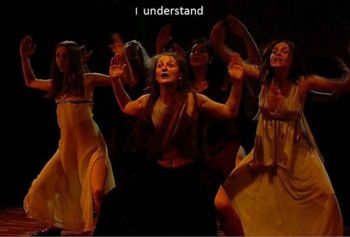 In the next clip, the chorus use cheironomy to perform a war between the sexes to the accompaniment of a choral song sung partly in ancient Greek.