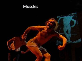 Subsequently the chorus leader cries out words relating to poses that constitute the alphabet: ’beautiful!’, and the chorus members cup their breasts; ‘muscles!’, and they flex their muscles —each move mirroring gestures from a Greek vase- painting projected onto the screen. And the still movements pick up speed and develop into a vigorous dance.