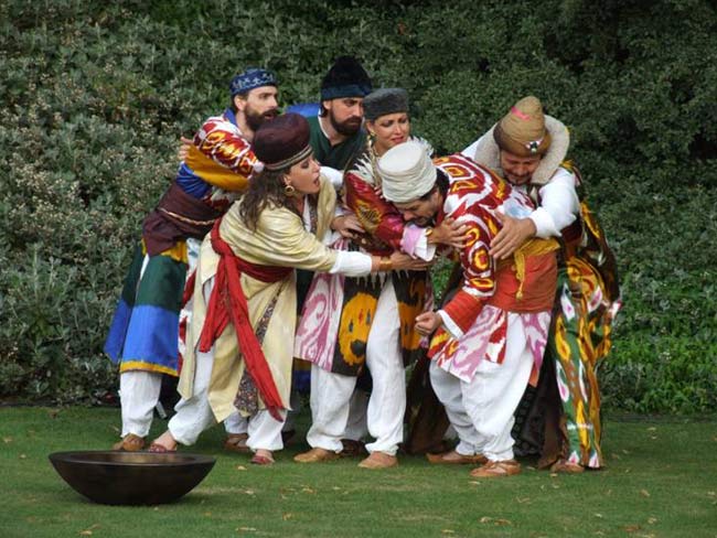 By contrast, the more ‘naturalistic; productions of Bacchae and Persians do expose aspects of the protagonists and of the chorus’s character which would be considered inconsistent both by Aristotle and by the Thiasos actors. These plays were performed mainly in English where the translator, especially commissioned for both productions was the classical scholar - Richard Seaford, an expert on the Bacchae and on the Dionysian mysteries. Glen Snowden, the choreographer for Bacchae has a strong background in ballet while the movement in Persians was devised by the company, through improvisation based on trance and lamentation rituals of Middle Eastern and Central Asian countries. Apart from lament songs from Tajikistan,the language and movement of these two productions-as you will see- are readily intelligible to most audiences.