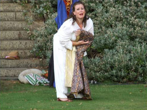 Between the second and third clips is a dream-like sequence which we invented (not shown in this document) where the Queen, Xerxes' mother, dresses Xerxes in his father’s - in Dareios’ - robes and gives him the imperial sceptre. As Xerxes becomes re-empowered the chorus revert to their cringing kowtowing responses and follow him off the stage.